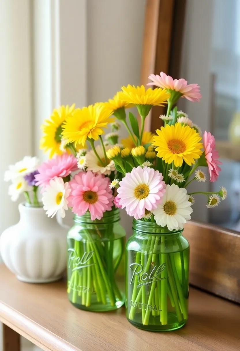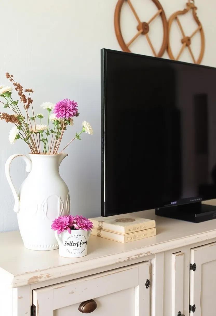 Mason jars full of fresh flowers add a touch of color and fragrance to any TV stand. The simple yet vibrant presentation brings a touch of nature indoors and enhances the farmhouse atmosphere.