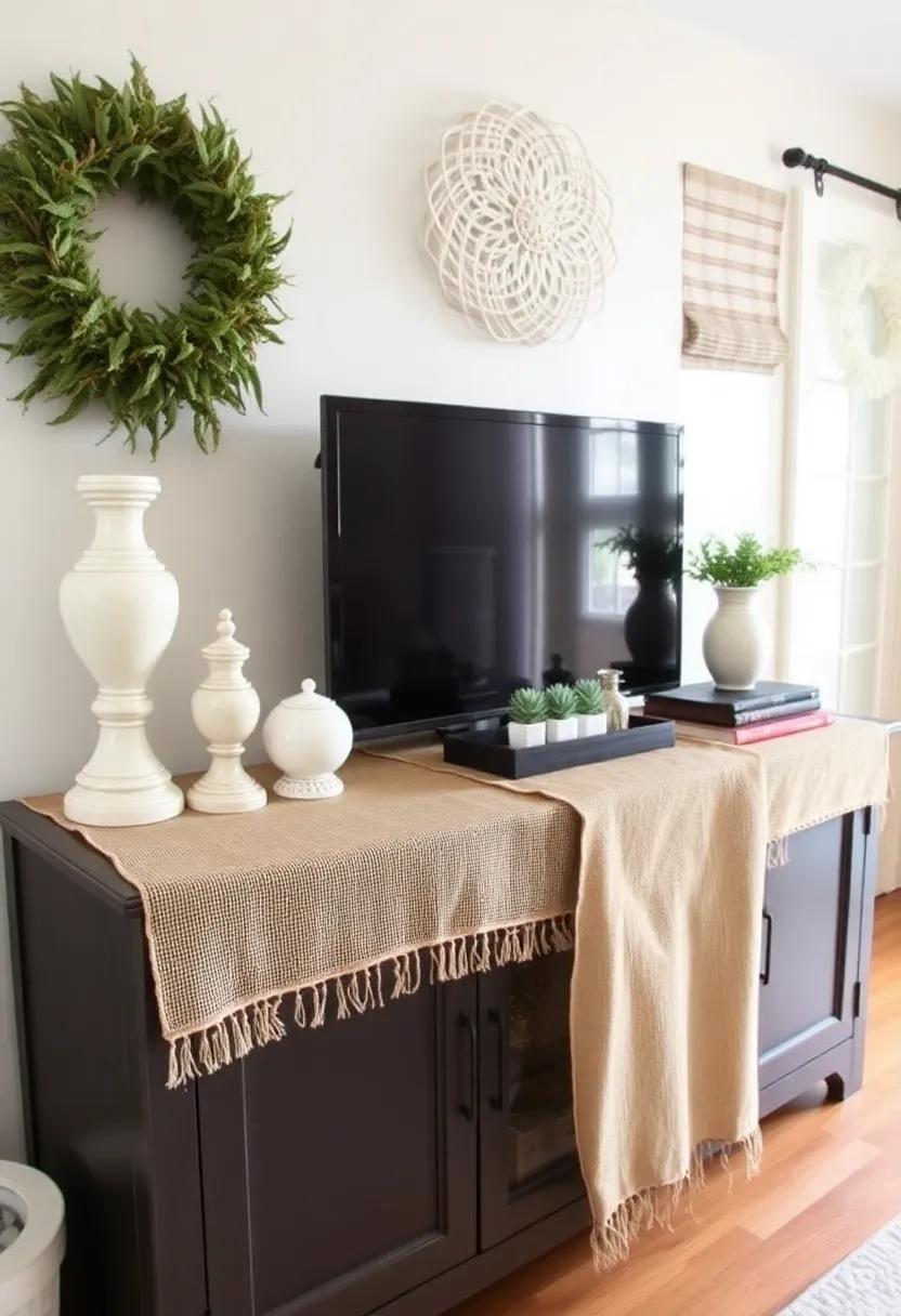 A rustic burlap runner drapes over a farmhouse TV stand, providing a textured canvas for decorative items. The burlap adds a tactile element that enhances the rustic charm while protecting the covered surface.