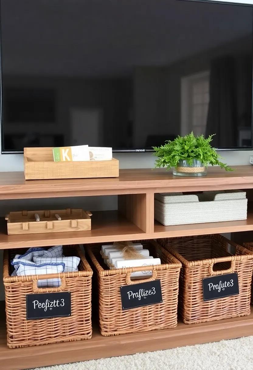 Rustic chalkboard labels offer an original yet efficient way to categorize goods in wicker baskets under the TV stand. This practical solution adds a touch of farmhouse charm while keeping items organized and easily accessible.