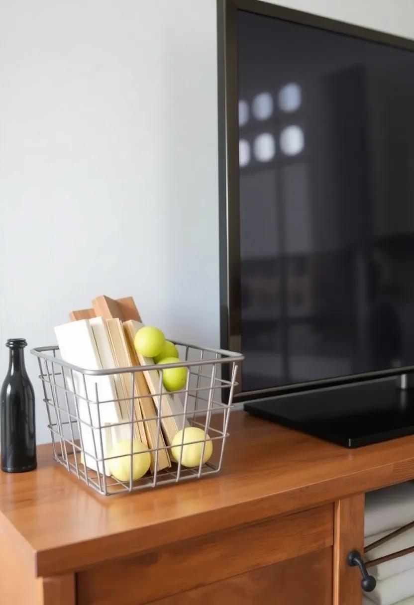 Wire baskets bring order to media chaos and keep things tidy on a practical TV stand. The industrial look of the wire baskets complements the country house style while providing a functional storage solution.