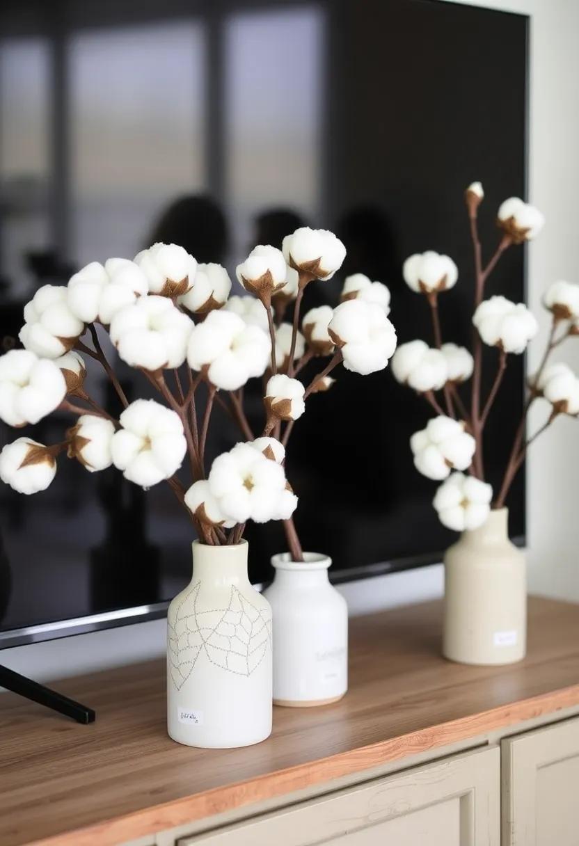 Simplicity looks beautiful on this TV stand with cotton-stemmed flowers in ceramic vases. The cotton’s fluffy texture and muted colors enhance the farmhouse aesthetic and create a cozy atmosphere.