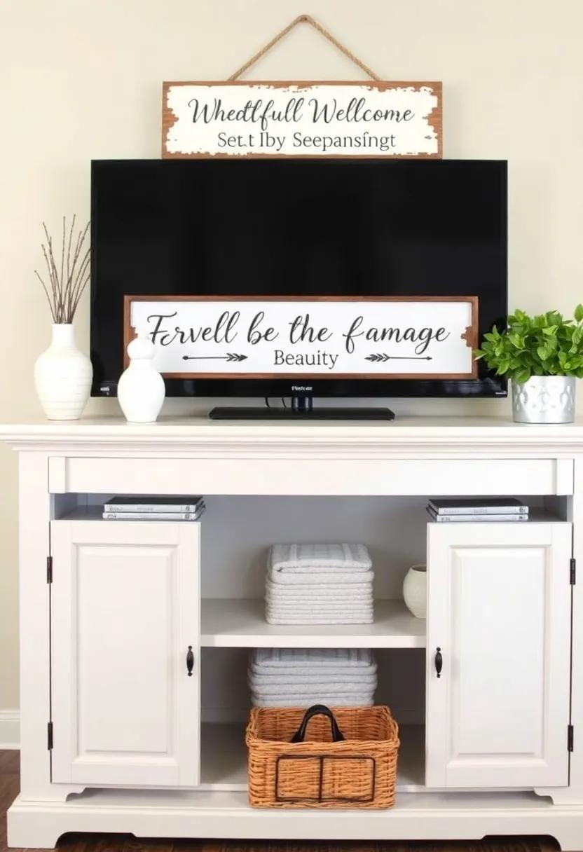 Cheerful farmhouse-inspired signs add personality and a welcoming touch when placed above TV stand shelves. These signs can have heartfelt messages or funny sayings to create a welcoming atmosphere in the living room.
