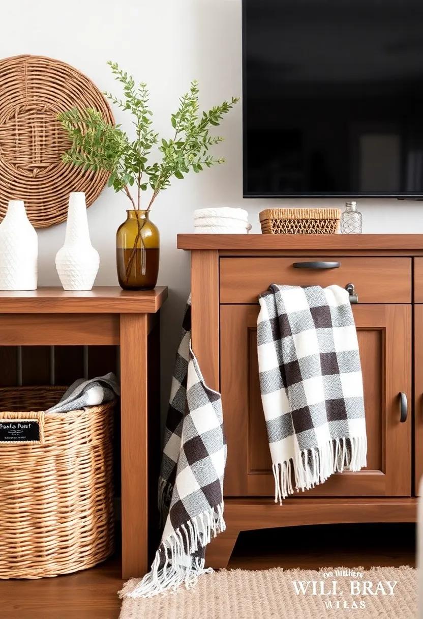 Wicker baskets next to the wooden TV stand add coziness and checkered throw blankets you can tuck away for cozy evenings at home.