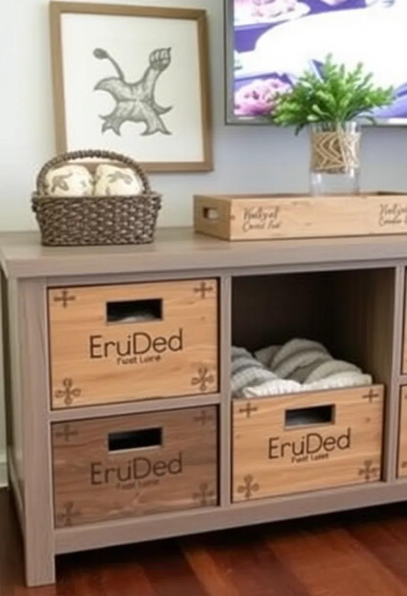 Wooden boxes in TV stand compartments are innovative storage solutions that double as farmhouse TV stands and exude country charm.