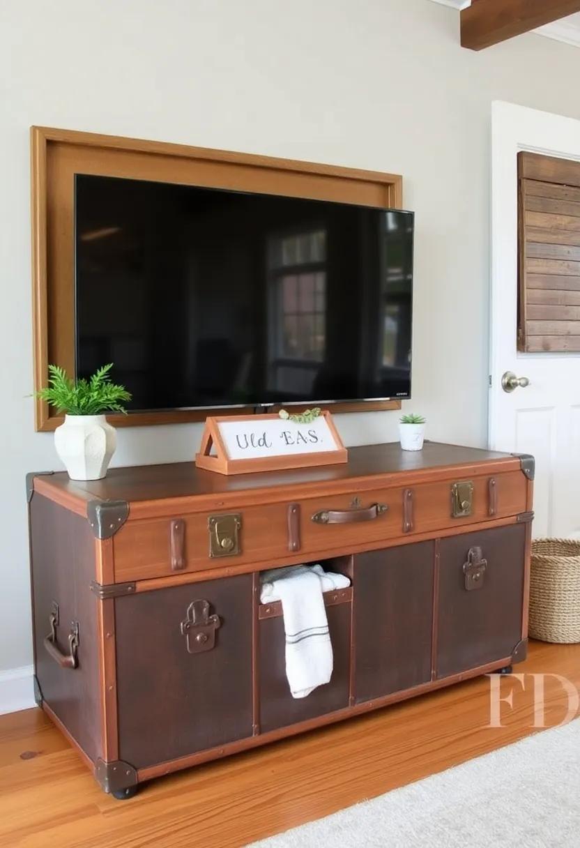 Vintage suitcases repurposed as TV stands solve modern storage problems with an antique touch. The trunks add character and a sense of history, making them a unique and functional addition to the farmhouse decor.