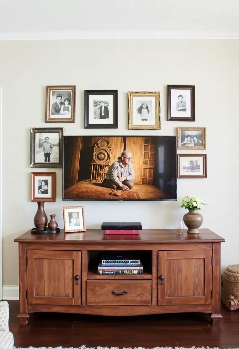A TV accent wall becomes a nostalgic gallery with weathered framed photos above the rustic TV stand. The aged frames add character and a personal touch and make the living space appear more intimate and homely.