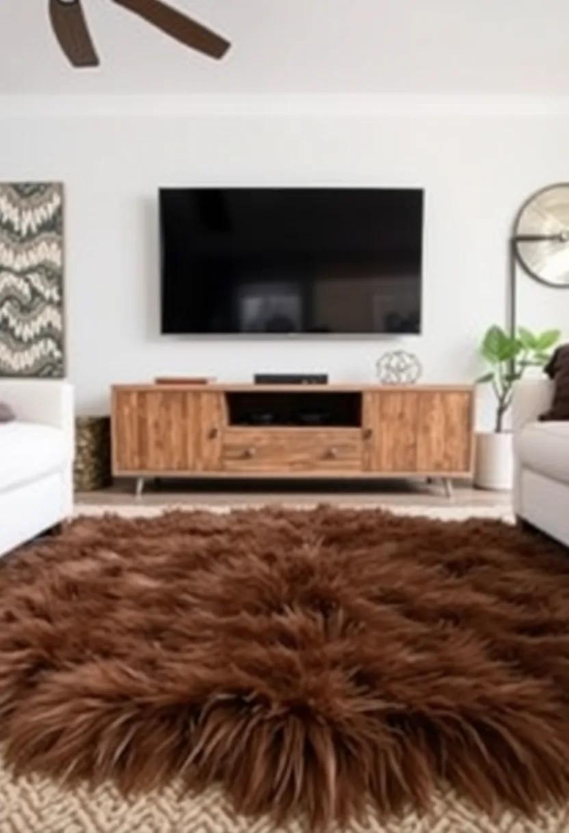 The texture of a faux fur rug spreads invitingly in front of the reclaimed wood TV stand, adding warmth to the media room. This cozy addition increases comfort and creates a luxurious contrast to the rustic decor.