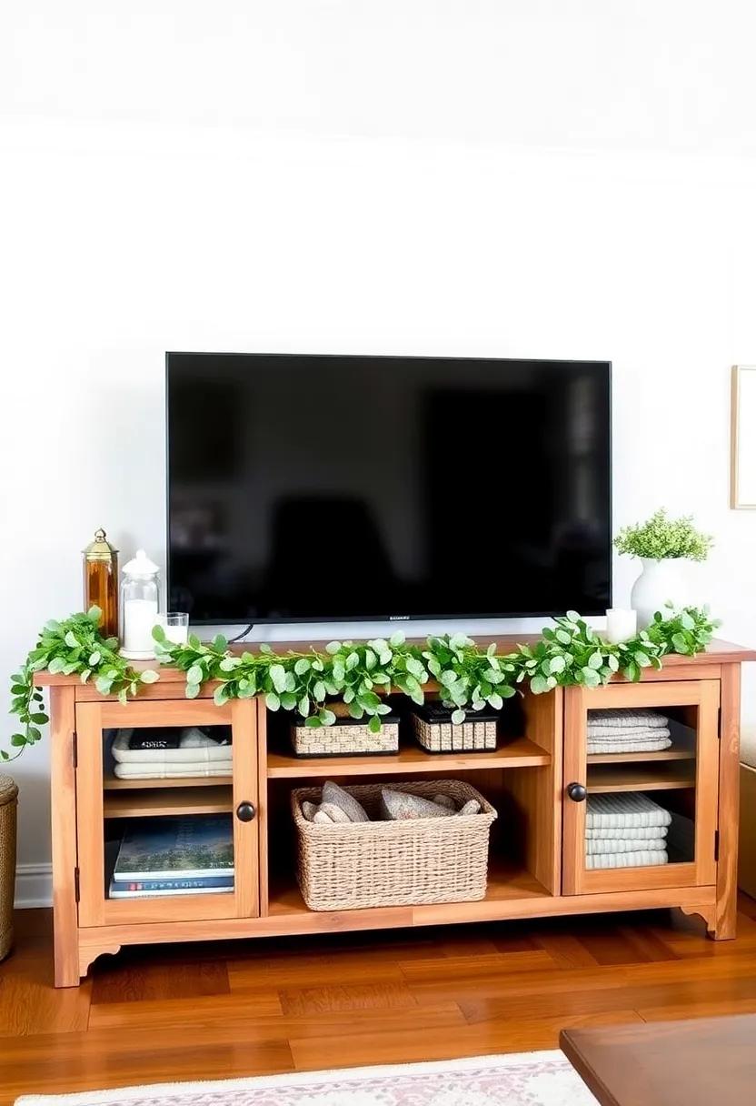 A TV stand made from reclaimed wood becomes a refreshing focal point in the living room with a lush eucalyptus garland. The greenery adds a natural element that enhances the farmhouse charm and makes the space feel lively and inviting.