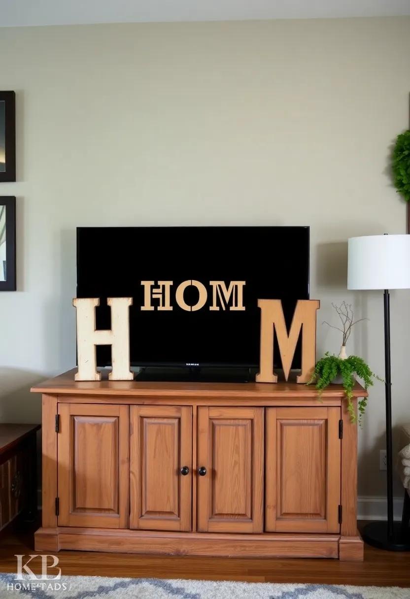 Wooden letters spelling out “HOME” on a TV stand add to the heartwarming atmosphere of the living space. These wooden letters complement the old wooden TV stand and make the room look more intimate and cozy.