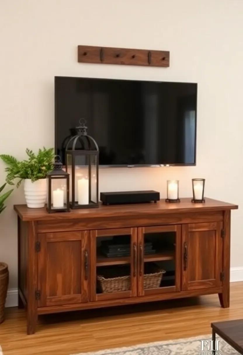 Rustic metal lanterns on a TV accent wall stand add a rustic, inviting glow to the room while adding a farmhouse style to the furniture.