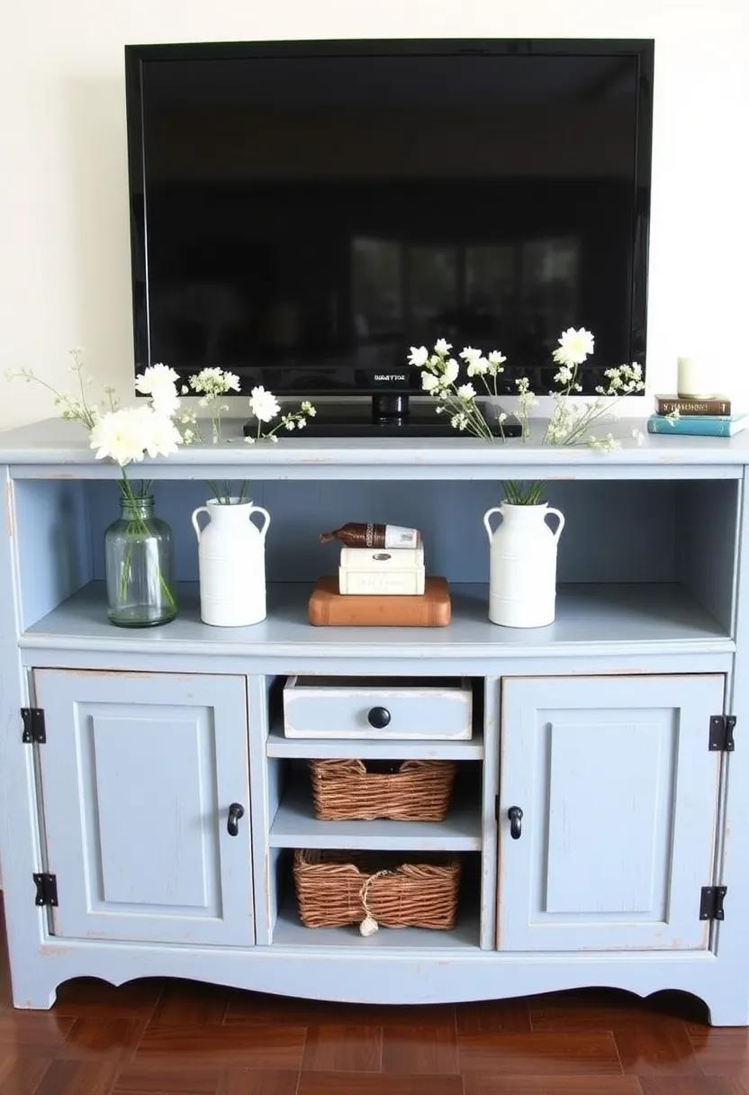 Classic milk can vases frame this distressed blue-gray TV stand, giving it a farmhouse feel. These vintage-style vases can hold fresh or dried flowers and add a rustic touch to the decor.