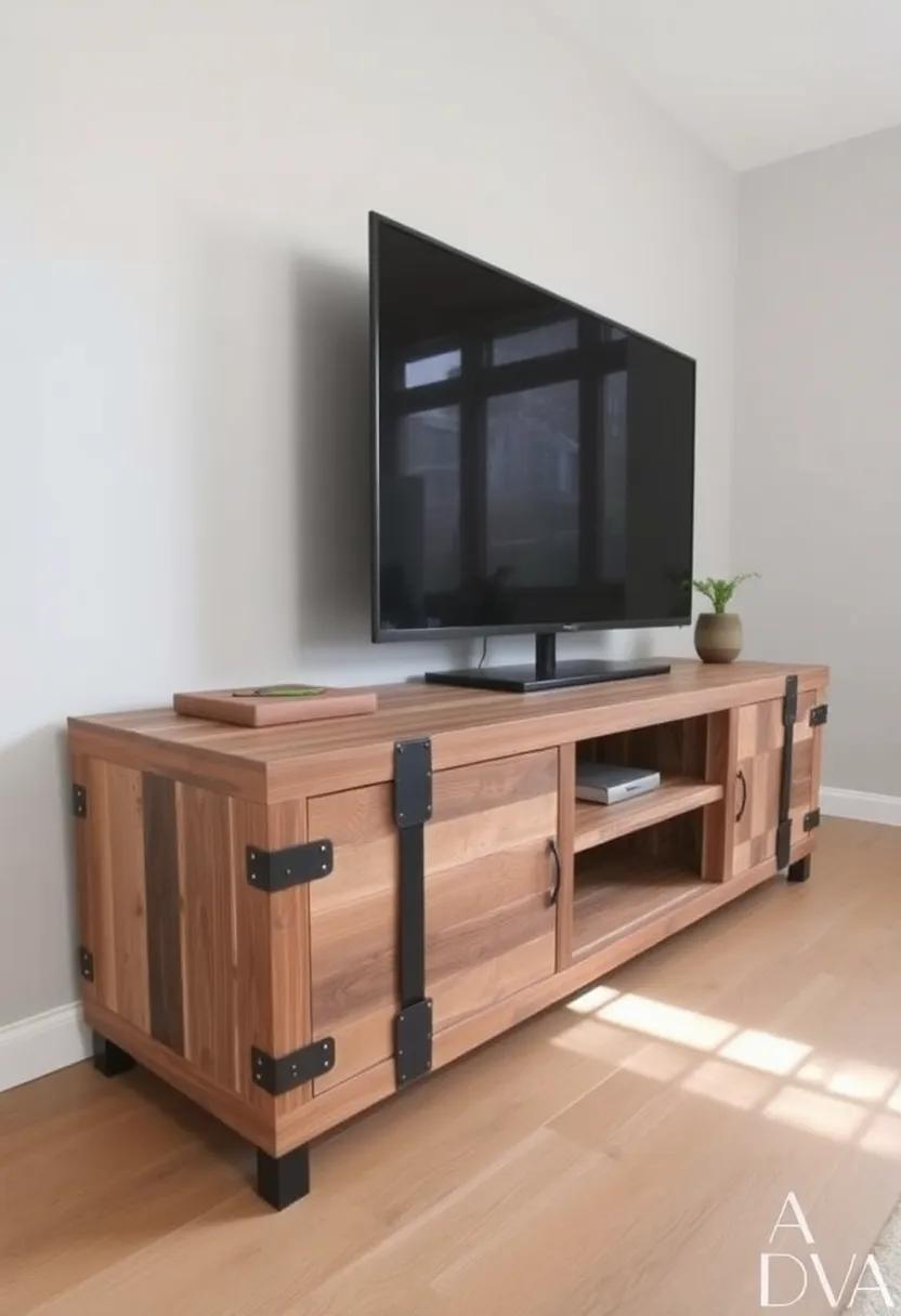 A TV stand made from reclaimed wood impresses with sturdy industrial hardware, creating a striking media console. The combination of weathered wood and metal accents offers a unique blend of rustic and industrial style.