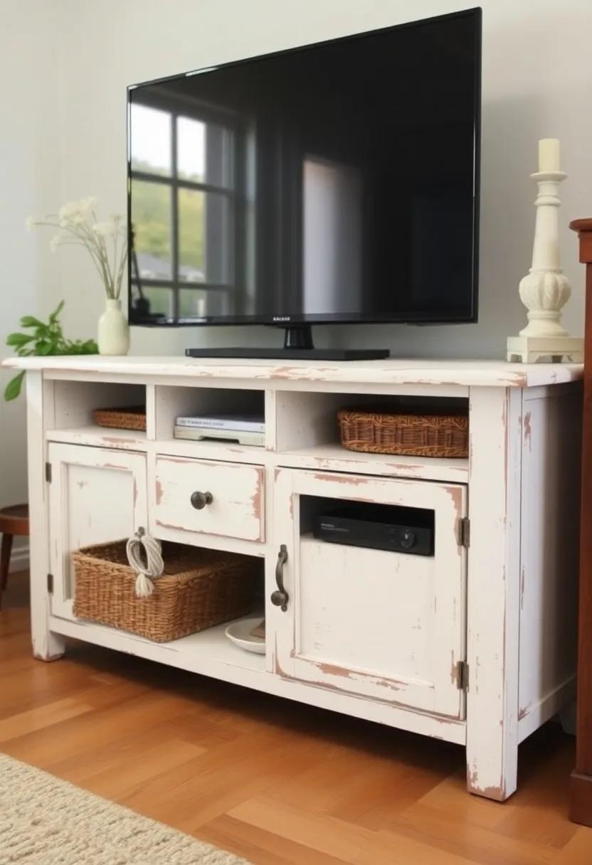 A farmhouse TV stand in distressed white paint pairs beautifully with vintage finds. The used look and old-fashioned accessories create a nostalgic atmosphere, perfect if you value timeless elegance.