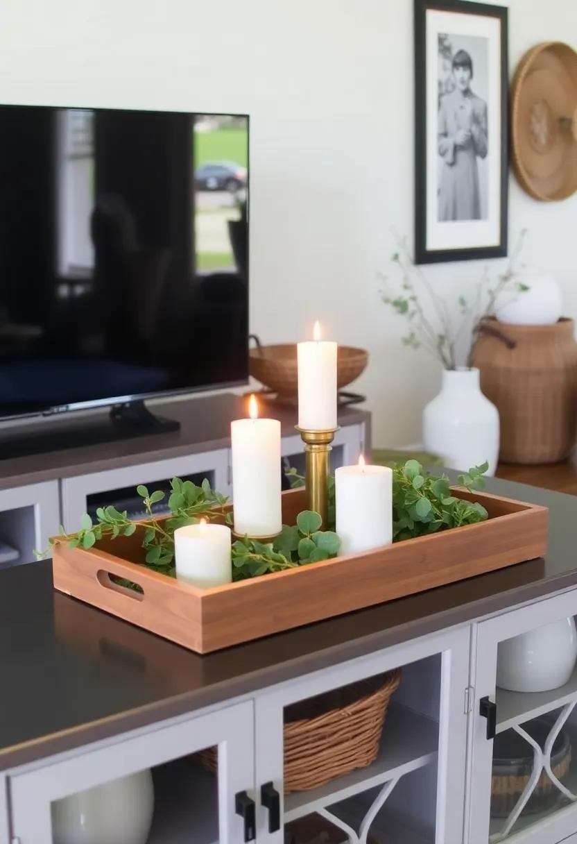 Greenery and flickering candles on a wooden tray on a TV stand add a sense of serenity and life to the room. Complement them with wicker baskets and ceramic vases for a farmhouse aesthetic that creates a calming atmosphere.