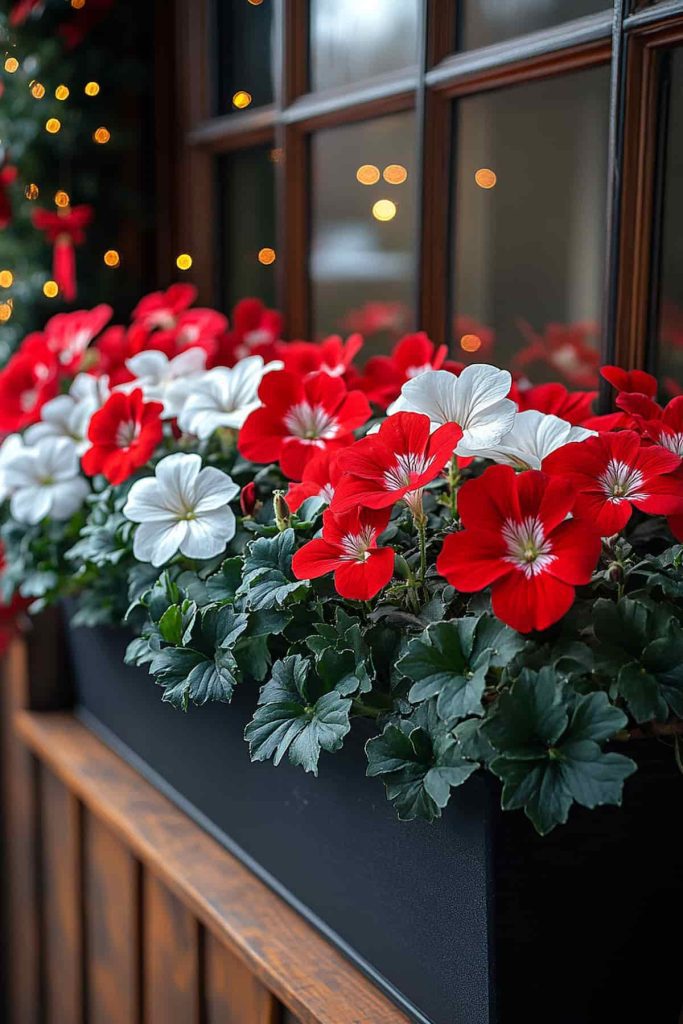 To add a fresh touch to traditional Christmas decorations, consider filling your window box with red and white geraniums and their leaves. These beautiful flowers bloom in winter and give your home a happy and festive atmosphere.