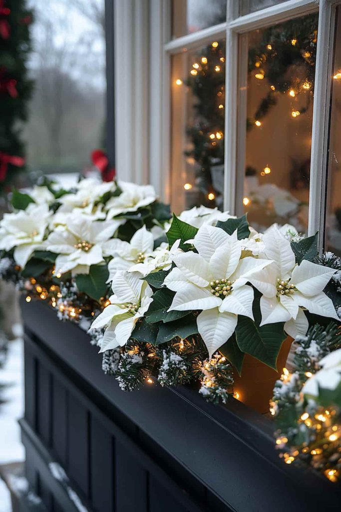 White poinsettias line this window box, with each petal adding a sense of sophistication. A touch of glamor with glittering elements such as the golden flowers and the surrounding bright lights make these poinsettias a special eye-catcher.