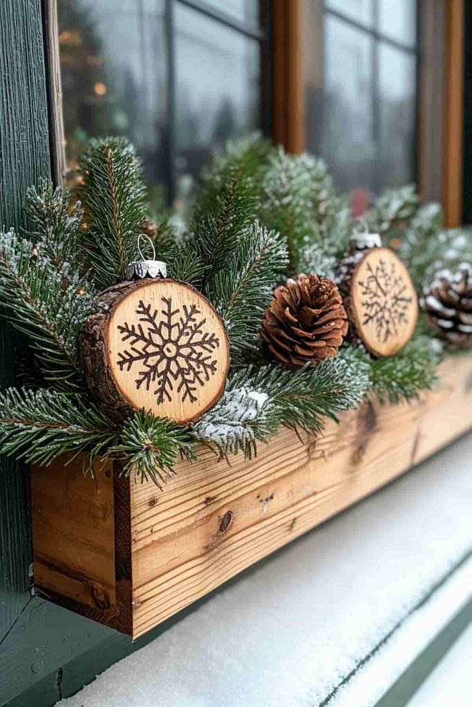 This window box design is a stunning choice for lovers of the great outdoors! Earthy and calming, it features cedar branches, pine cones and rustic wooden ornaments that work harmoniously to create coziness and cohesion.