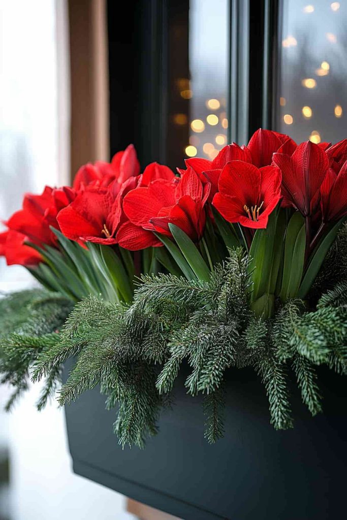 With its naturally dramatic appearance, the red amaryllis is ideal for a Christmas window box with tons of flair. Add lush evergreen branches to beautifully showcase the rich red hue.