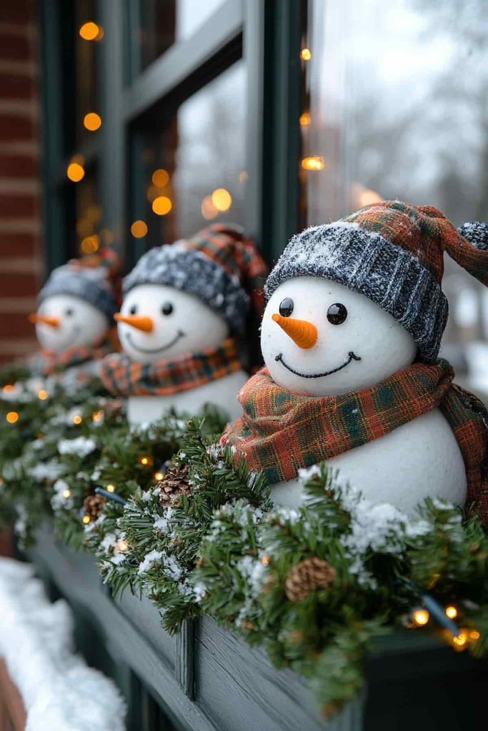 Mini snowmen peeking out from cedar branches create a fun, festive scene right at your window. Kids and anyone young at heart will surely love this idea!
