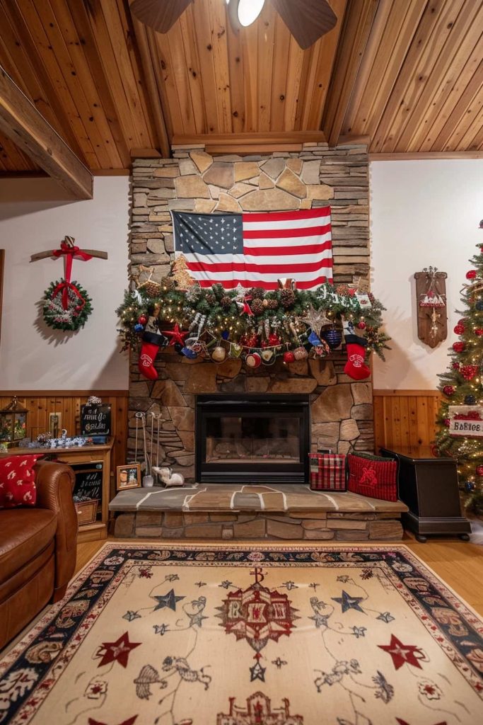 Strategically placed silver stars that seem to dance playfully when they hang on the patriotic fireplace. A garland made of leaves, tinnecones, buildingbles and column candles on silver candles is located above the fireplace.
