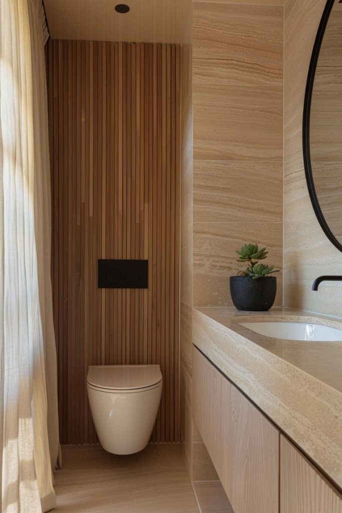 A sleek wall-mounted toilet saves space in this Japandi-inspired bathroom. Its clean lines and modern, minimalist design blend seamlessly with the room’s accent walls and textured walls.