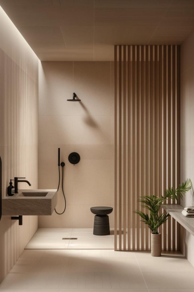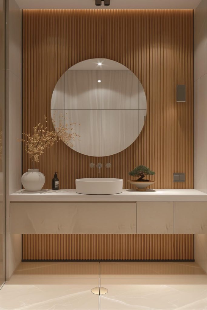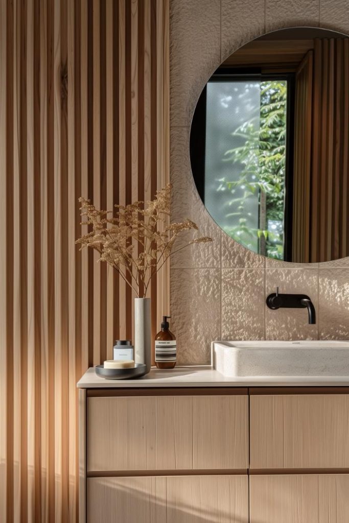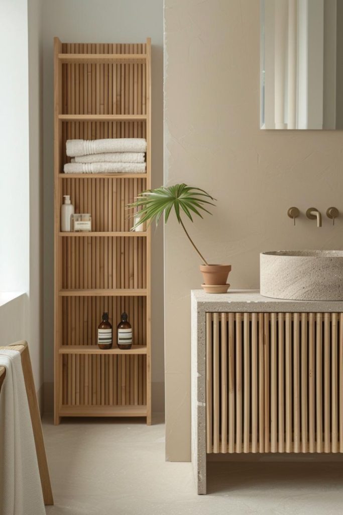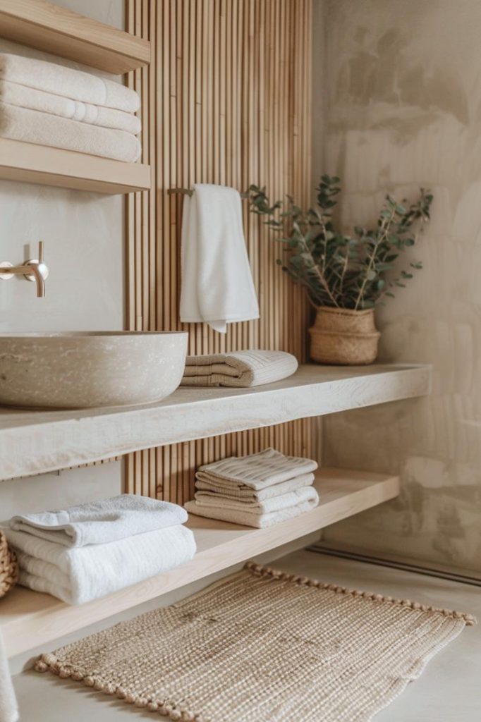 A harmonious mix of stone and wood elements characterizes this Japandi bathroom. Natural stone tiles pair beautifully with fluted wood accent walls and shelves, as well as a wood vanity.
