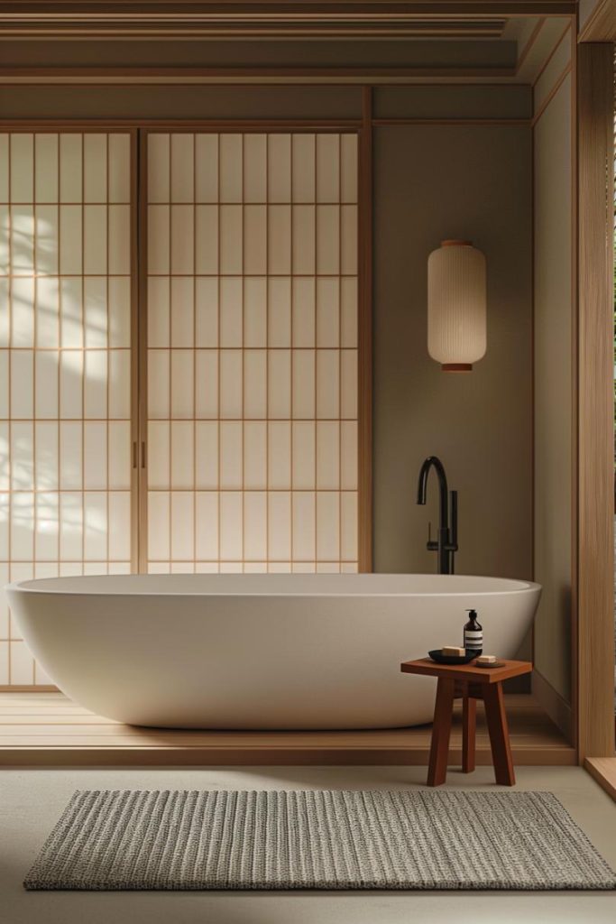 Shoji sliding doors draw on the Japanese influence in Japandi design and separate the bathroom from the adjacent areas.