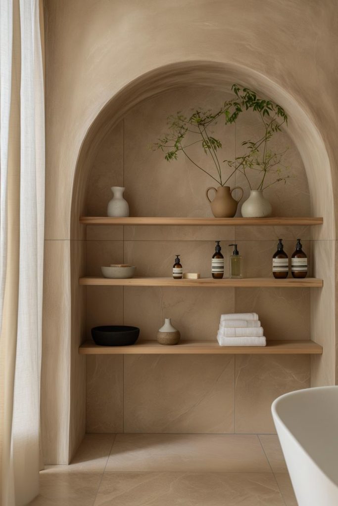 An arched shelf built into a plaster wall adds architectural appeal to this bathroom, as its gentle curve softens the lines of the room and creates a harmonious balance.