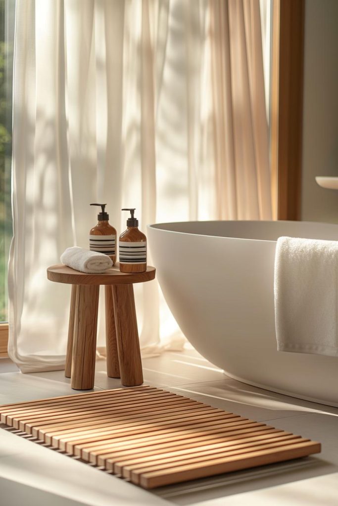 Multifunctional pieces are a must in Japandi bathrooms. For example, these wooden stools contribute to safety and also provide additional storage space for toiletries or bed linen.