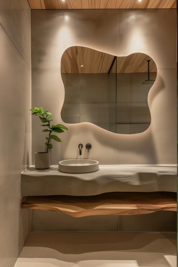 To add a soft, sculptural element to your streamlined Japandi bathroom design, opt for an organically shaped mirror. It gives the room a feeling of flow and fluidity and matches the shapes of the sink and shelf.