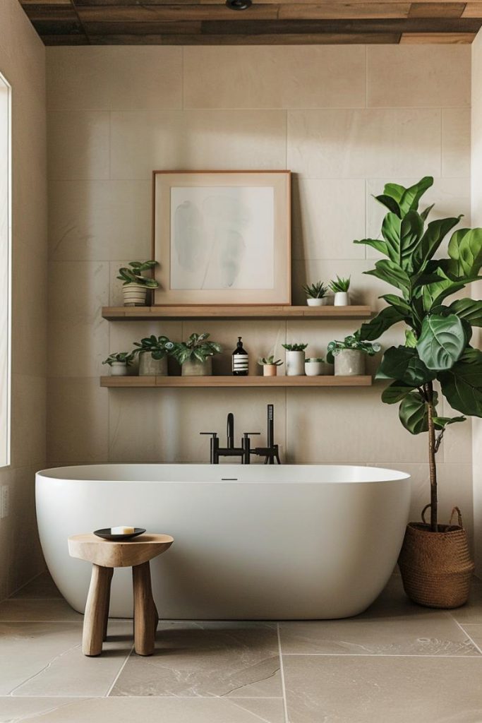 Lush plants bring life and vitality to this bathroom from Japandi. A fiddle leaf fig, a collection of potted succulents, and wood and wicker accents create a connection to nature and promote a calm atmosphere.