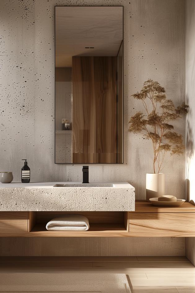 Incorporating concrete countertops into your Japandi bathroom design can help add a modern touch to the space and highlight the natural, earthy appeal of other elements.