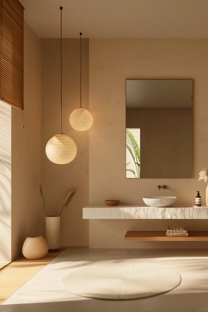In this room, delicate pendant lights hang from the ceiling, casting a warm glow on the vanity area. These eye-catching furnishings serve as functional works of art, combining form and function in true Japandi style.