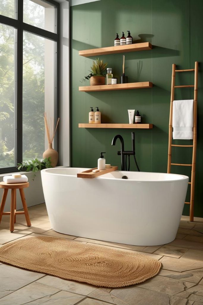 This forest-inspired hue not only provides a dramatic yet calming backdrop to a simple bathtub, but also harmonizes with the natural wood and woven elements typical of Japandi designs.