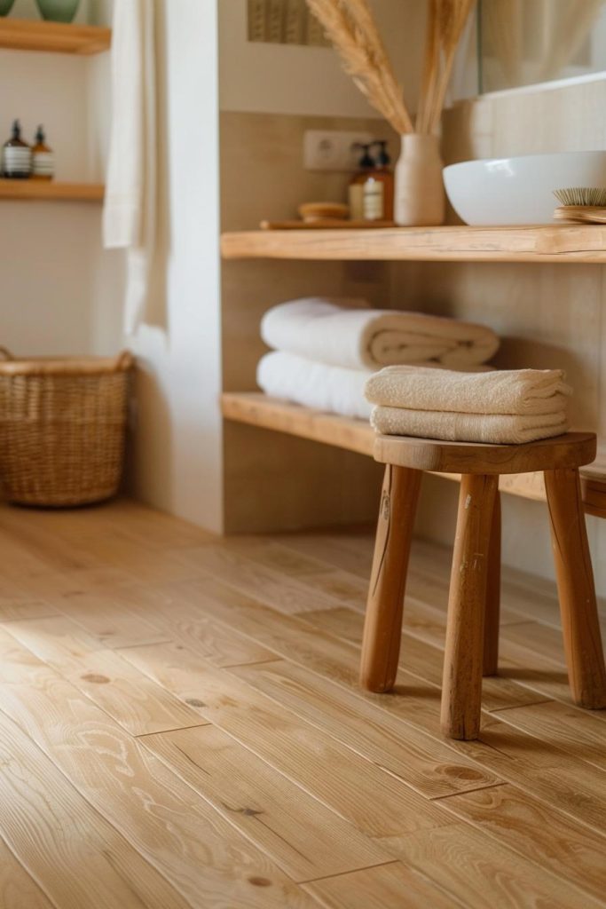 Are you worried that Japandi style wooden floor panels are too difficult to manage in a bathroom?
