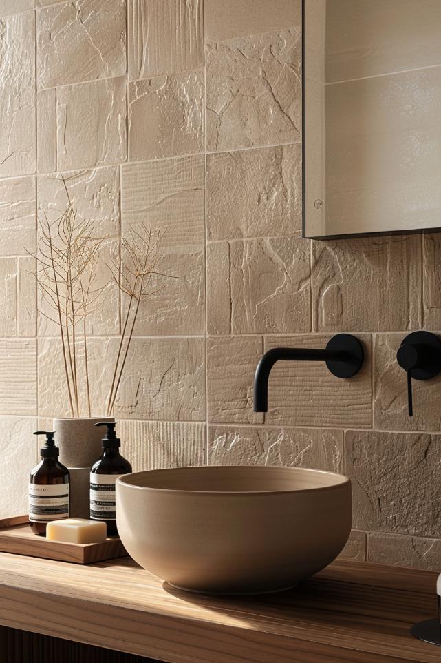 One of the best ways to enhance your Japandi bathroom design is to introduce subtle texture with embossed stone tiles. With their subtle pattern, they give walls or floors additional structure without overwhelming the senses.