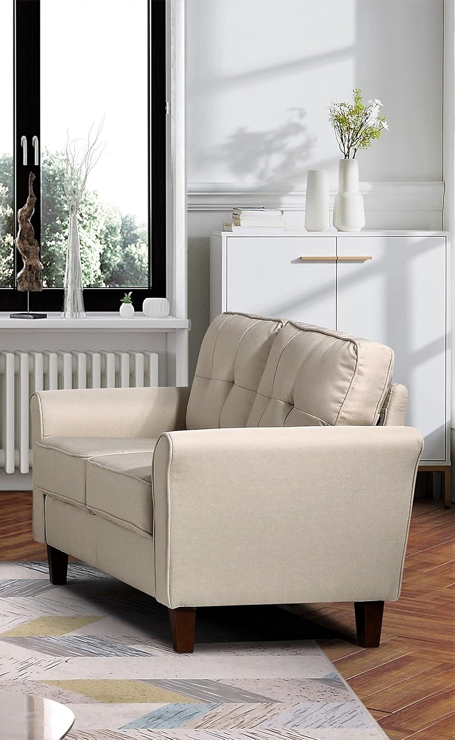 Set in place, the pair presents a grounded, compact silhouette that reads differently as light moves across the fabric — the beige/tan tone warms in late-afternoon sun and sits a touch cooler under overhead lighting. The rounded arms and plump cushions catch the eye first; you’ll likely notice small variations in the pile where you touch or brush the fabric, and the cushions tend to settle into their final shape after a few hours of use. For a few minutes after unpacking you’re mostly occupied with tucking in corners, screwing on feet, and evening up gaps between cushions, and those tiny actions change the initial impression more than any single detail does.