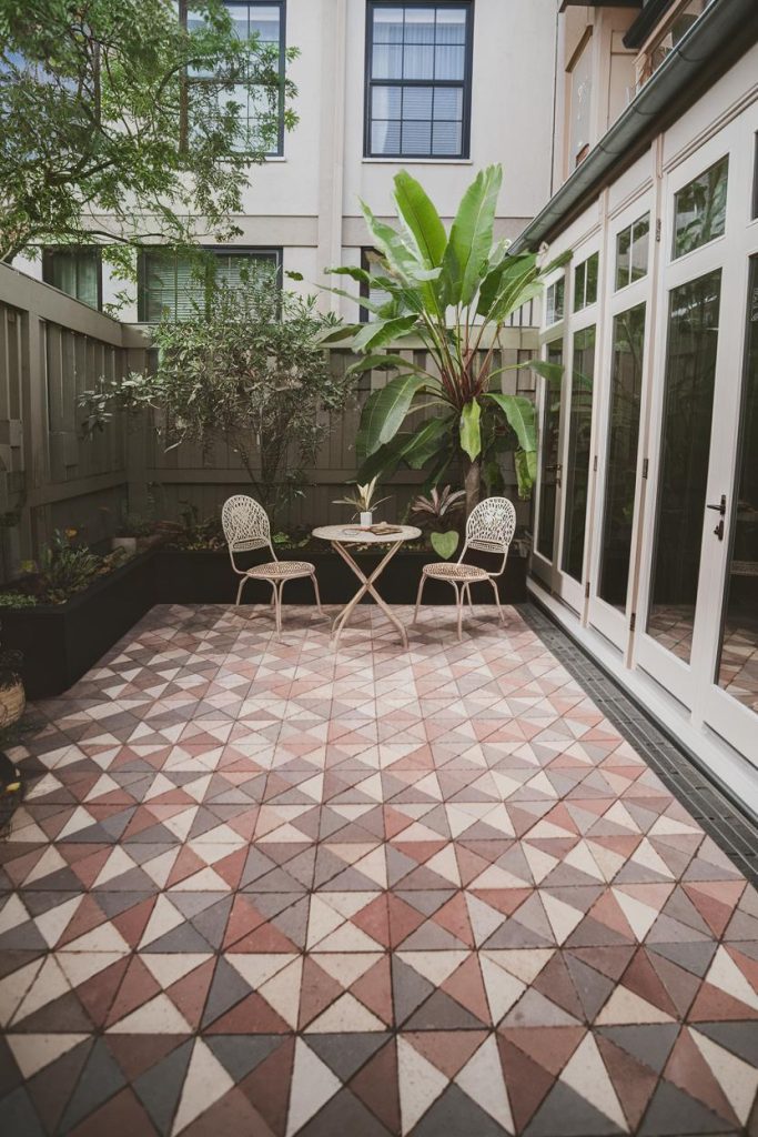 Modern outdoor patio with geometric paving, a metal chair and a small round table in the sunlight. Steps lead to an upper level.