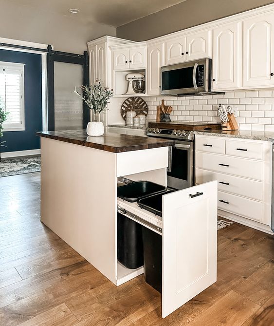 **Storage Solutions:** Utilize your kitchen island for additional storage with cabinets, drawers, and shelving. Keep pots, pans, and utensils organized and within reach. Consider installing a pull-out spice rack, trash bins, or a wine rack for added functionality.