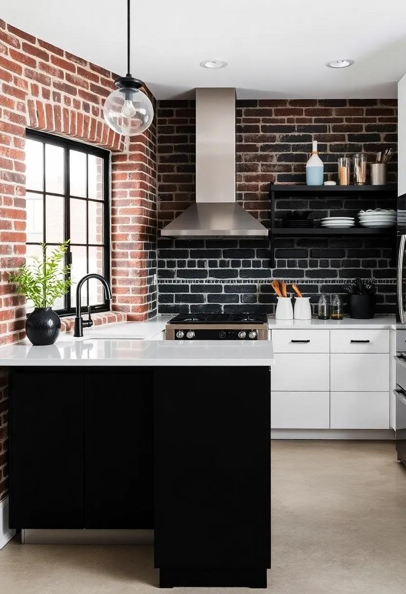 When designing a black and white kitchen with industrial inspiration, consider incorporating sleek stainless steel appliances and fixtures. These will complement the exposed brick and metal accents beautifully, creating a cohesive and uniform look throughout the space. Additionally, adding black cabinetry or countertops can further enhance the monochrome magic of the kitchen.