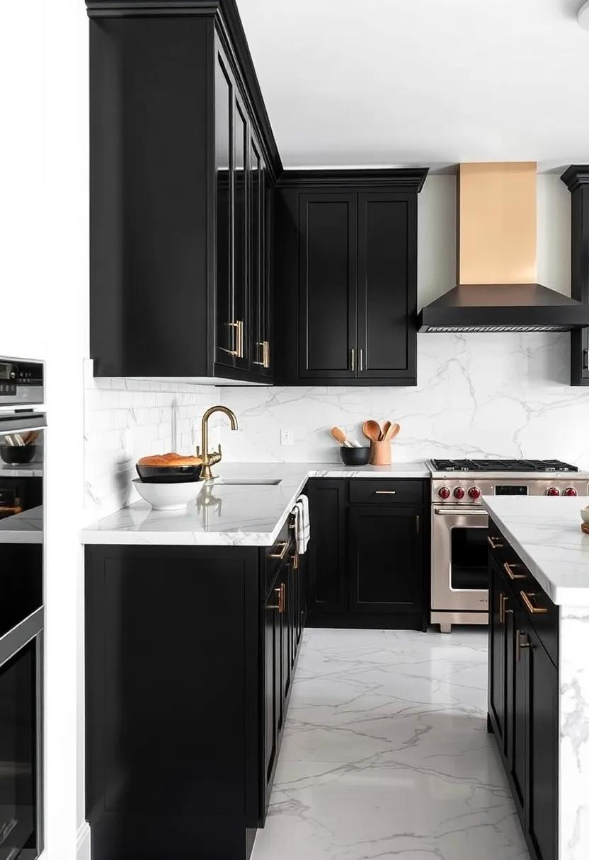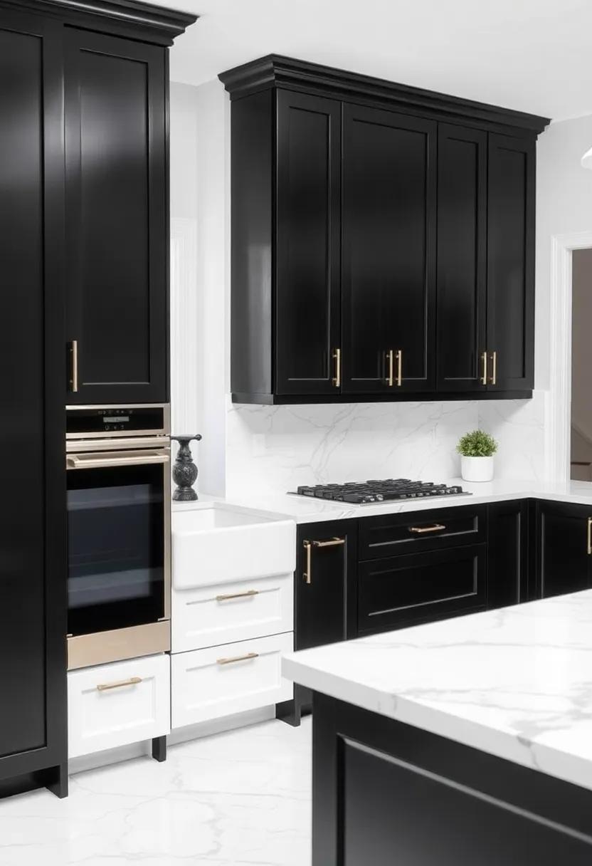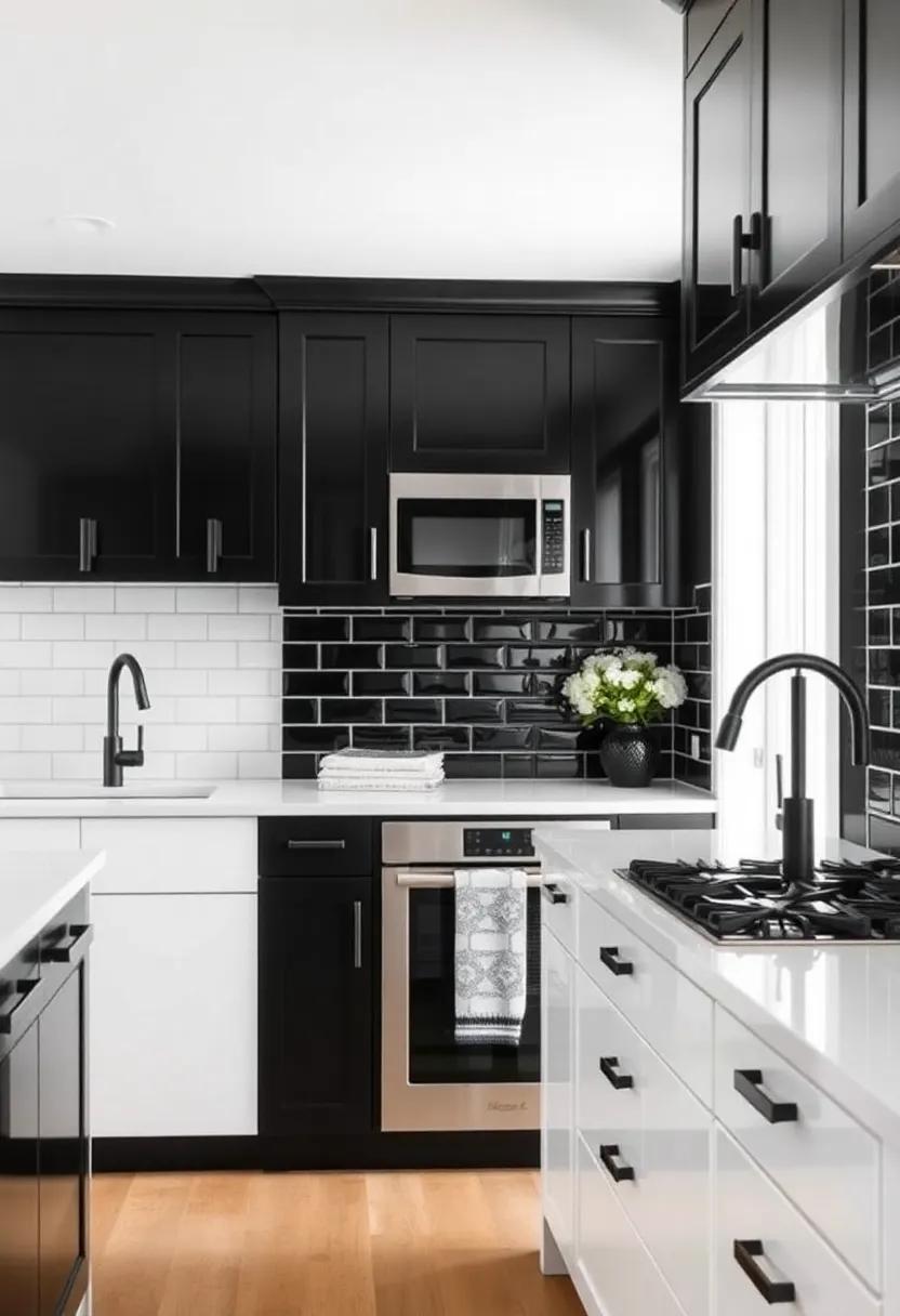 **Black and white cabinets:** Opt for sleek black cabinets paired with crisp white countertops for a striking contrast that adds depth to your kitchen space. Consider adding a pop of color with gold or silver hardware for an extra touch of elegance.