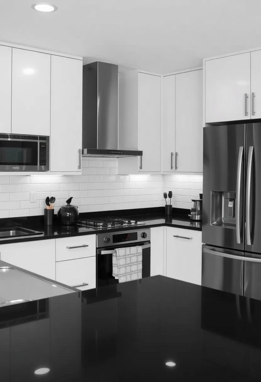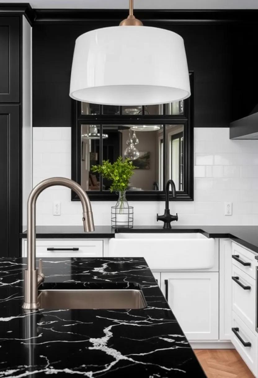 For those looking for a more subtle approach, consider a white marble countertop with black accents. This classic choice adds a touch of elegance to any kitchen, while the black accents provide a hint of drama. Pair this with matte black fixtures and hardware for a cohesive look that exudes sophistication. Don’t be afraid to mix and match textures and finishes to create visual interest and depth in your monochrome kitchen design.