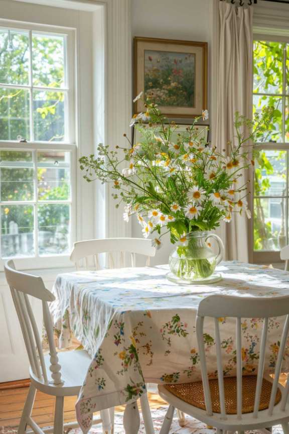 Garden flowers awaken on this dining table with a soft, flower blossom tablecloth under a Wildflower vaseCover the room in a touch of spring.