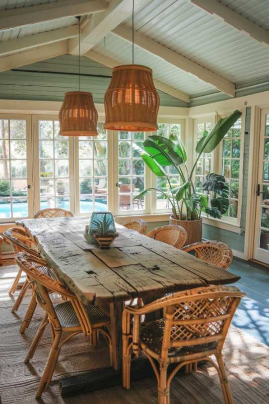 A group of charming rattan chairs gathered around a rustic wooden table with the promise of long, cozy meals that were full of laughter and stories.