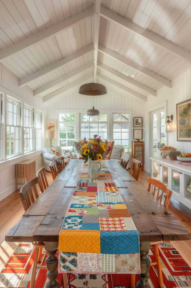 A quilted runner sweeps over the surface of the dining table. The color patchwork of the landscape gives every meal divided here and stands out against the wooden dining table.