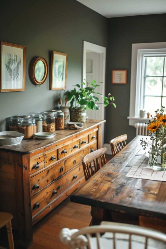 A vintage sideboard that polished wood into a honey glow offers a nostalgic backdrop for glass glasses and ceramic goods in this rustic and charming dining room.