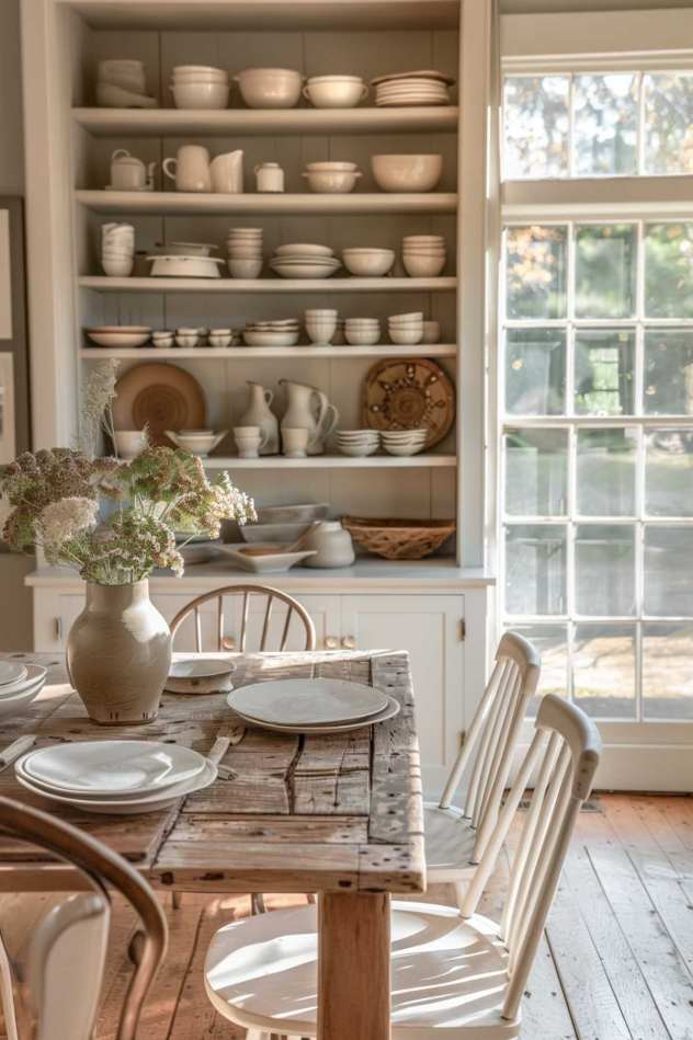 A collection of saucers, jugs, shells and plates gives the room craftsmanship on open shelves and emphasizes the homely feeling of a picturesque dining room for cottagecore.
