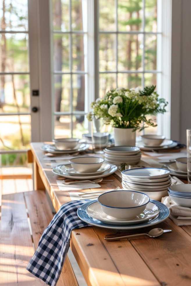 Classic emailware dishes, usually white with a blue edge, are reminiscent of a feeling of nostalgia and simplicity in your dining room. These durable and timeless pieces can be combined with wooden tables and Gingham bed linen to improve your cottagecore setting.