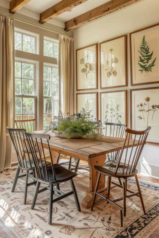 Walls adorned with framed botanical prints create a gallery of art that emphasizes the connection of the dining room to the natural world.