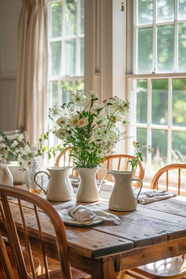 Pretty white jugs, full of bukolical charm, sit on a wooden table and serve both as a decorative element cottagecore and as a functioning flower vase or water vessel.